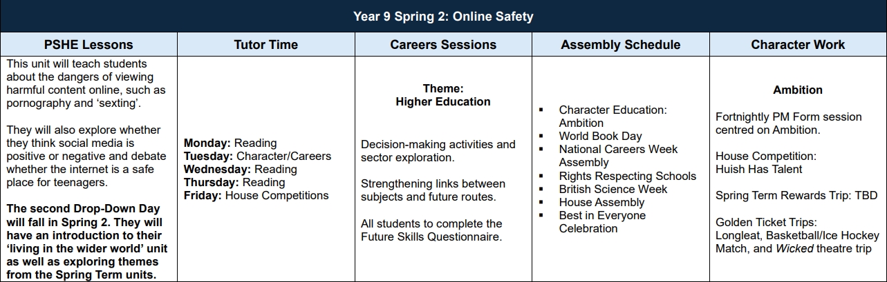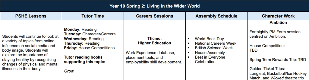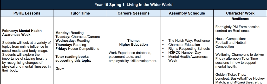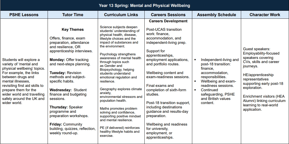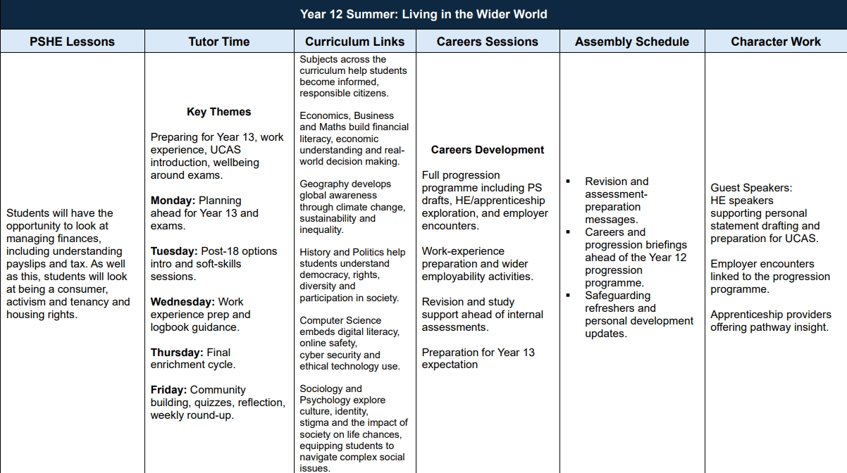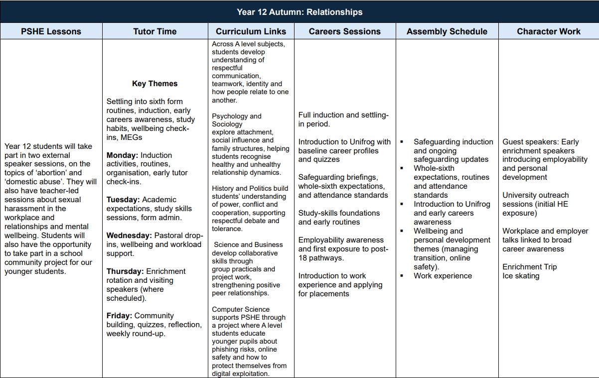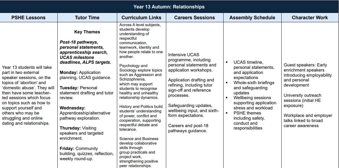 From Years 7–9, students have a timetabled PSHE lesson every fortnight, complemented by three ‘Drop-Down’ days each year when all students (Years 7–13) step off timetable to engage in PSHE learning with our teaching staff and external specialists. In addition, provision includes bespoke tutor sessions, whole-school assemblies, and a comprehensive Careers Information, Advice and Guidance (CIAG) programme, ensuring that personal development is woven throughout the school experience.
