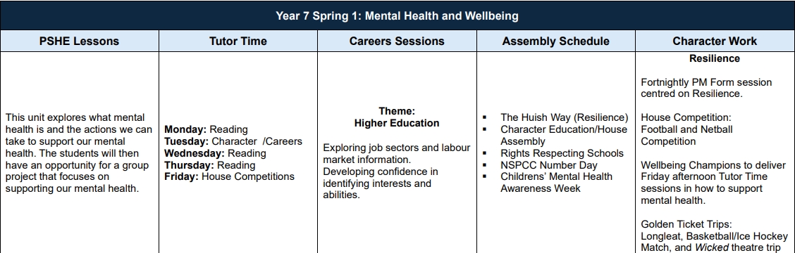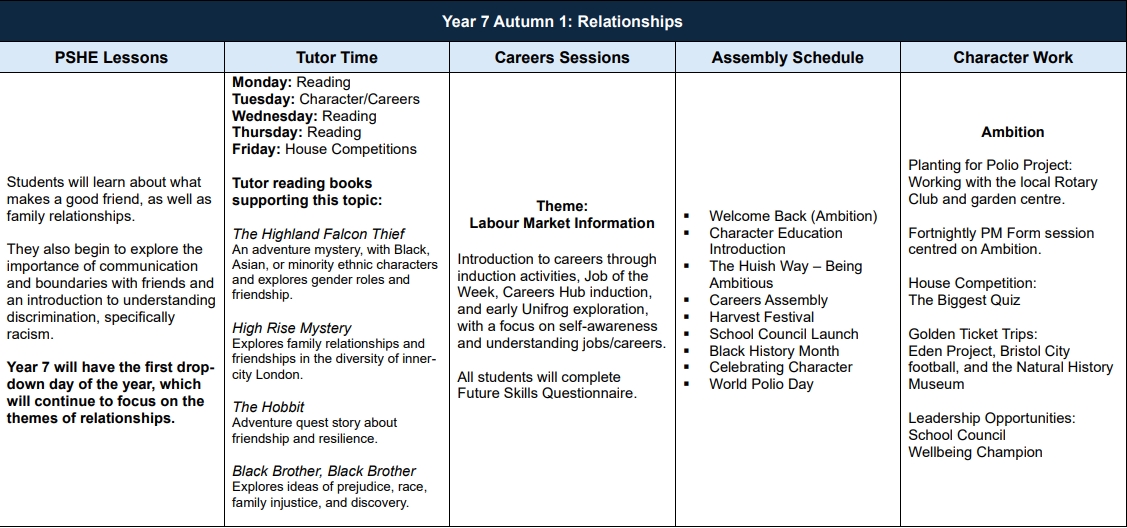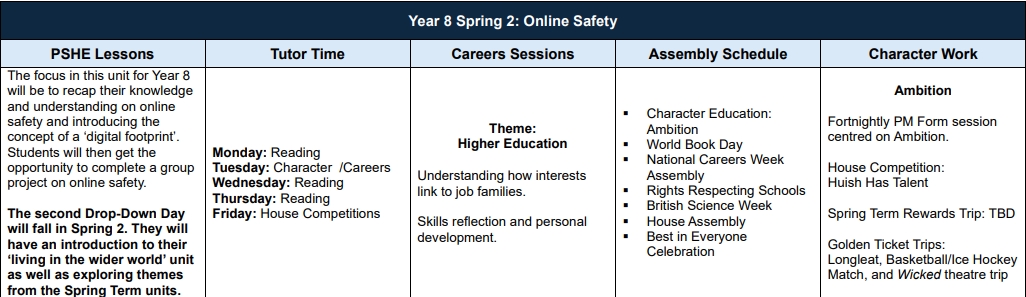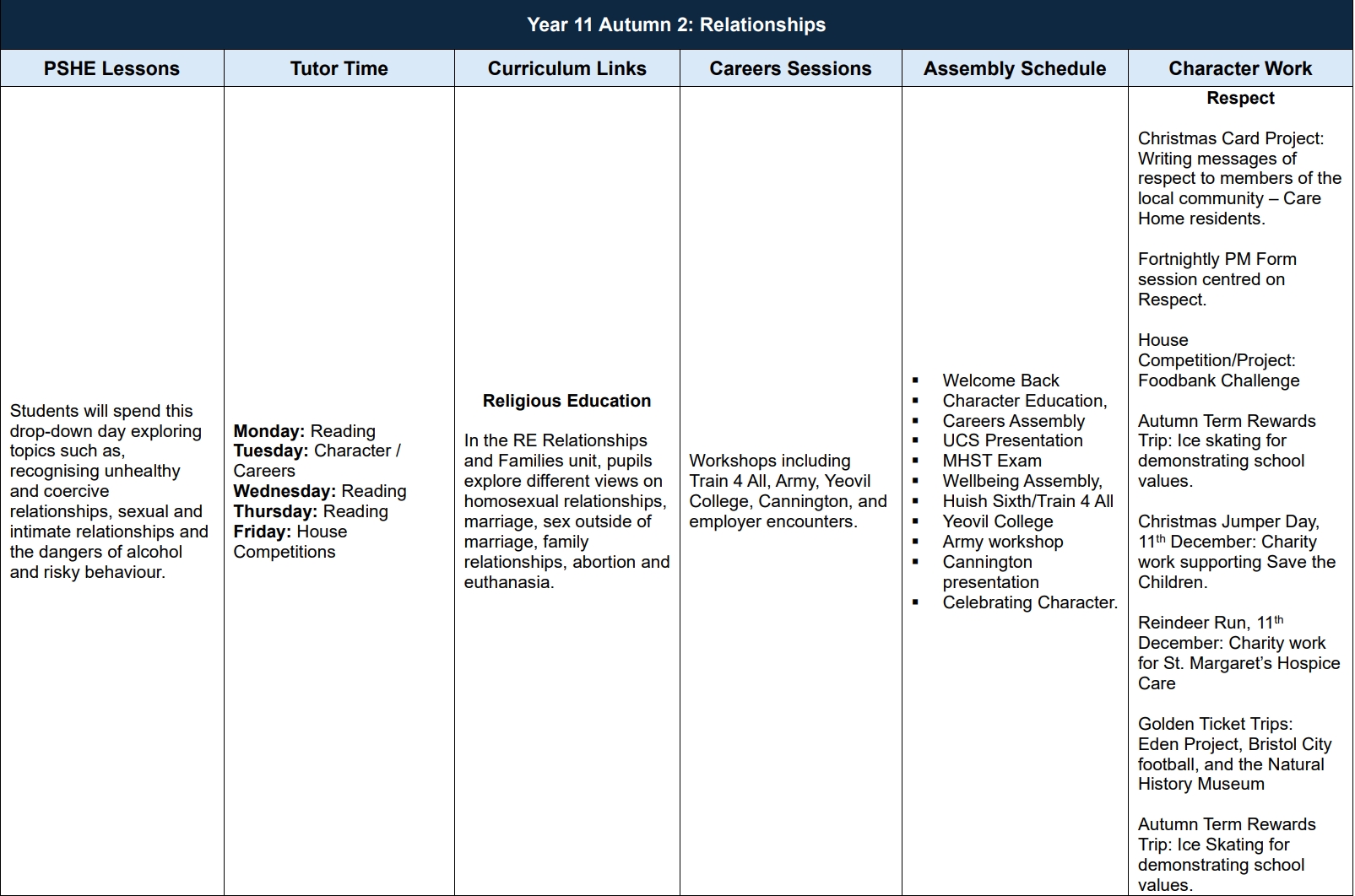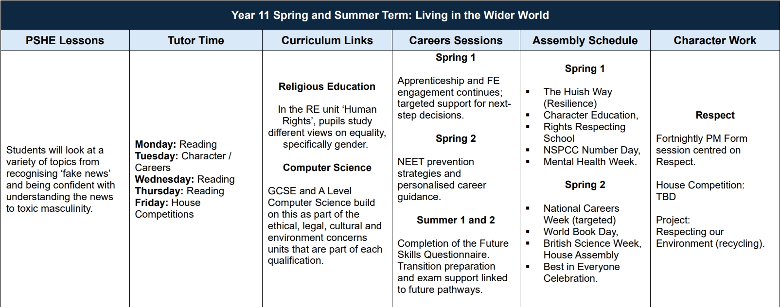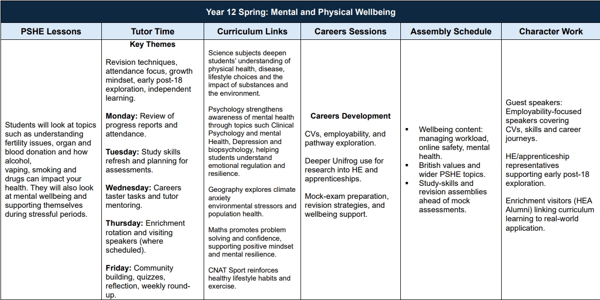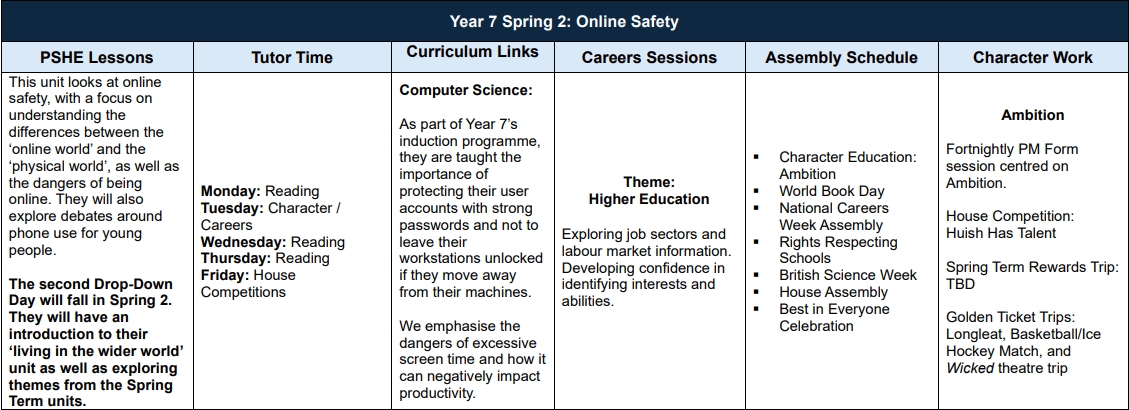 From Years 7–9, students have a timetabled PSHE lesson every fortnight, complemented by three ‘Drop-Down’ days each year when all students (Years 7–13) step off timetable to engage in PSHE learning with our teaching staff and external specialists. In addition, provision includes bespoke tutor sessions, whole-school assemblies, and a comprehensive Careers Information, Advice and Guidance (CIAG) programme, ensuring that personal development is woven throughout the school experience.